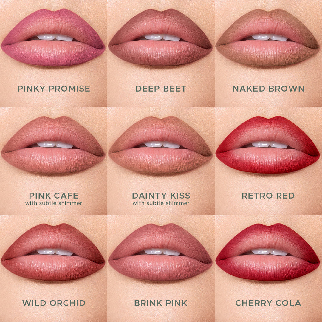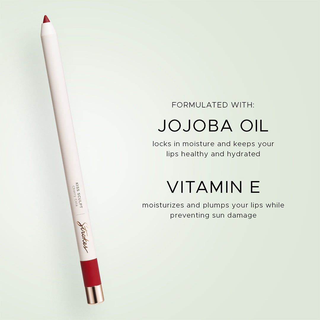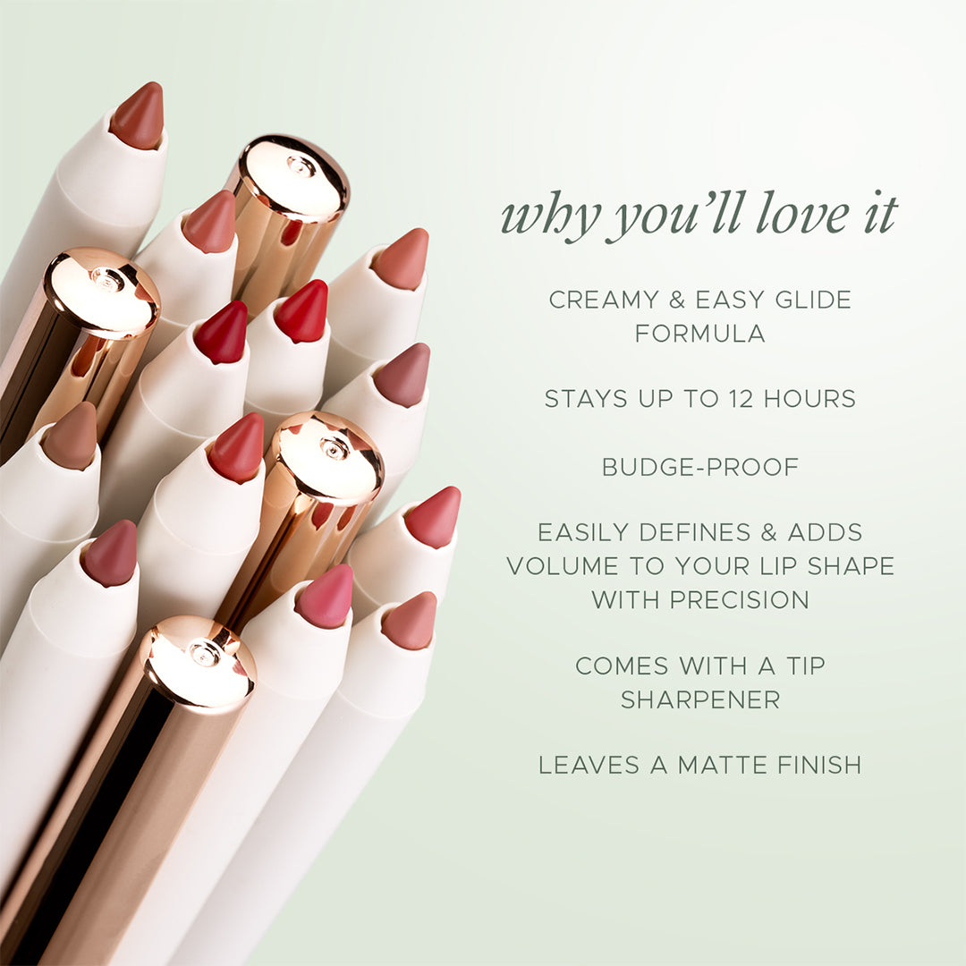 This buildable matte lip liner sculpts your pout for up to 12 hours of wear with its budge-proof formula that easily glides on your lips. Each shade hugs every lip with Jojoba Oil & Vitamin E leaving each kiss supple and deeply moisturized.